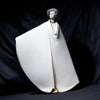 Your first glance is captured by the dramatic sweep of her cloak—a cascade of pristine porcelain that appears simultaneously fluid and architectural. This extraordinary garment unfurls into a bold, almost shield-like shape, dominating the space with its pure, geometric volume. This purity is dramatically punctuated by a single, mesmerising vertical accent: a slender, precise ribbon of lustrous 24-karat gold. This gold element is the signature touch of luxury, lending a regal, almost mythical aura to the figure concealed within the sweeping drapery.